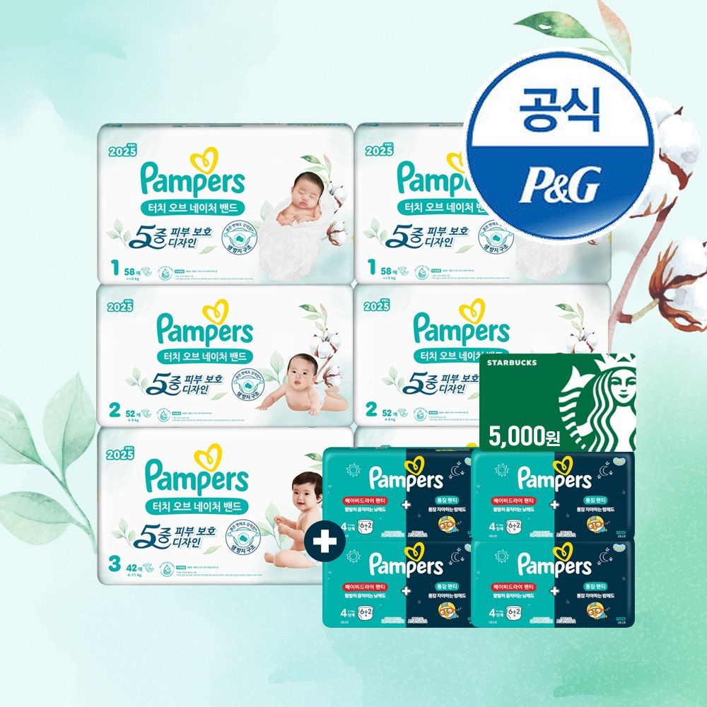 [팸퍼스] 2025 터치오브네이처 밴드형 기저귀 1 ~ 3단계 6팩 (총 2박스) + 4단계 체험팩 3팩 증정