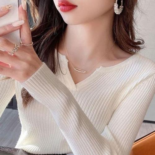 여성용 브이넥 니트웨어 봄 가을 이너웨어 레트로 일본 스타일 2025 신상 루즈핏 긴팔 크루넥 탑