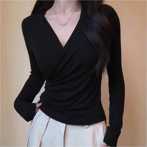 [OFKKN9OT]여성 엑스형태 랩티셔츠 슬림핏 골지 V넥 긴팔