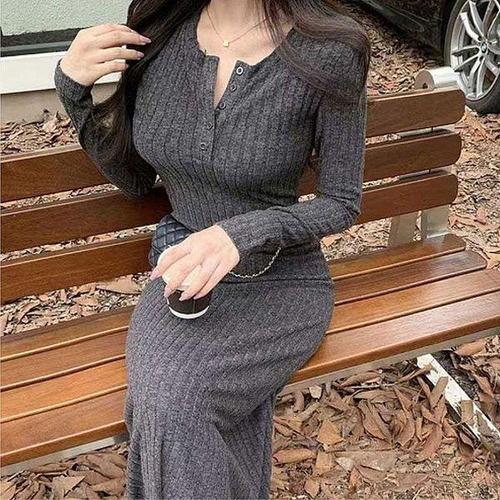 [옷자락]여자 무지 바스트 꼬임 긴팔 a라인 니트 롱 원피스