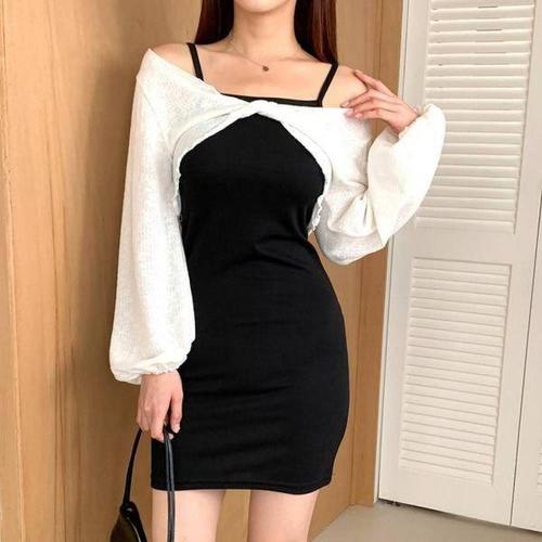 [에이치플러스몰]롱니트 미페스 긴팔 뷔스티에 끈원피스 여름 셔
