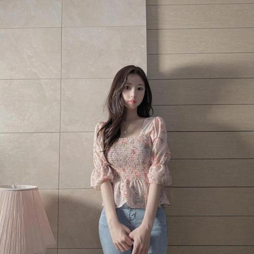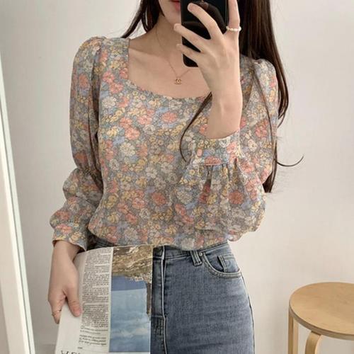 [다잇템]여자 시폰 벌룬 소매 스퀘어넥 꽃무늬 블라우스 (10573385A)