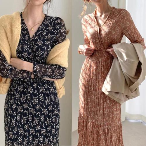 [다잇템]여자 꽃무늬 롱슬리브 허리 V넥 시폰 원피스 (10592280A)