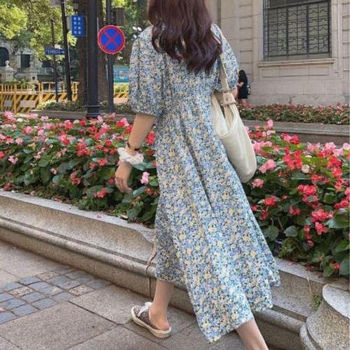besteffie 여성용 꽃무늬 롱 원피스 봄 여름 패션 퍼프 소매 슬림 허리 드레스 a라인 롱 원피스 K71