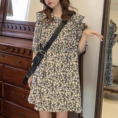 슬리밍 플러스 사이즈 여름 드레스 꽃무늬 프린트 루즈핏 배 커버 짧은 소매 미디 드레스 통통한 자매를 위한 트렌디 스타일