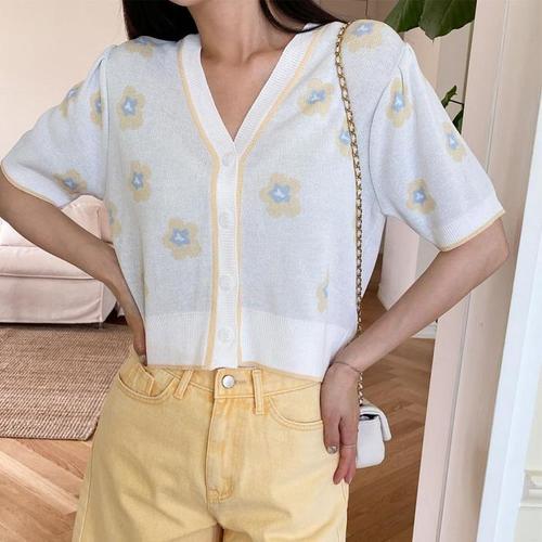[다잇템]여자 패턴 V넥 꽃무늬 스웨터 반소매 가디건 (10367748A)