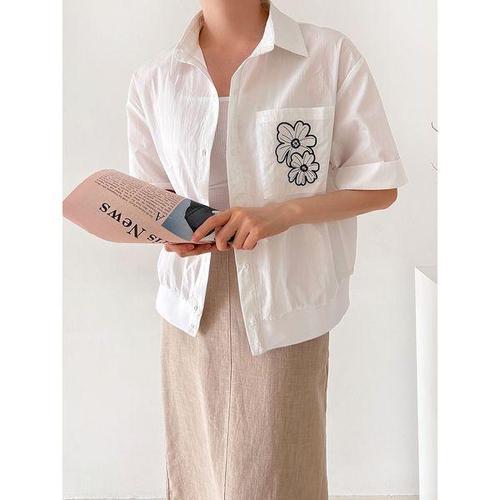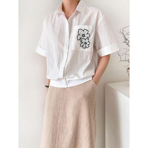 여성 카라넥 루즈핏 포켓 꽃자수 반팔 블라우스 CAT-WBL-4639-화이트