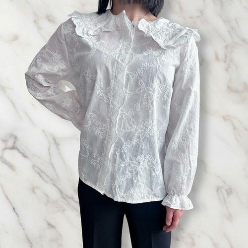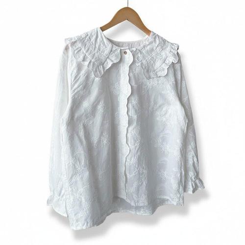 [신상오픈런]여성 프릴 카라 물결 꽃 자수 화이트 블라우스