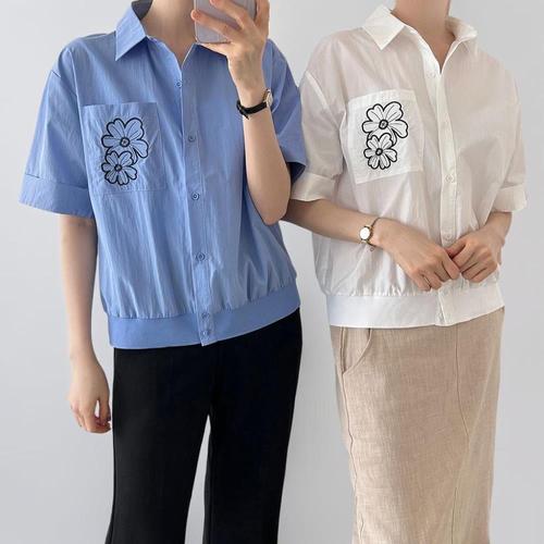 여성 카라넥 루즈핏 포켓 꽃자수 반팔 블라우스 CAT-WBL-4639-소라