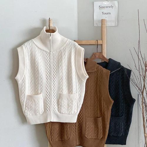 [옷자락] 여자 클래식 비스코스 꽈배기 반목 니트 집업 베스트