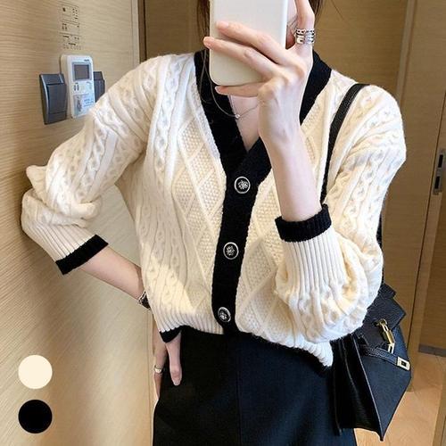 [신상오픈런]여성 두꺼운 니트 브이넥 꽈배기 버튼 퍼프 가을 카디건 (40734268)
