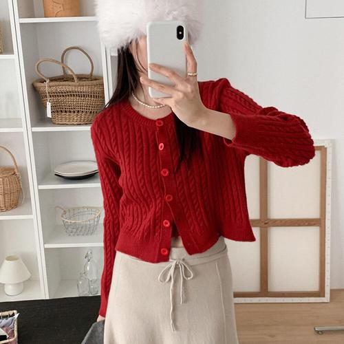 [옷자락]여자 빨간색니트 라운드넥 가디건 꽈배기나시 세트