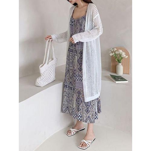 [미라클세븐]여자 와플 배색 라운드넥 가디건 끈나시 롱원피스 세트