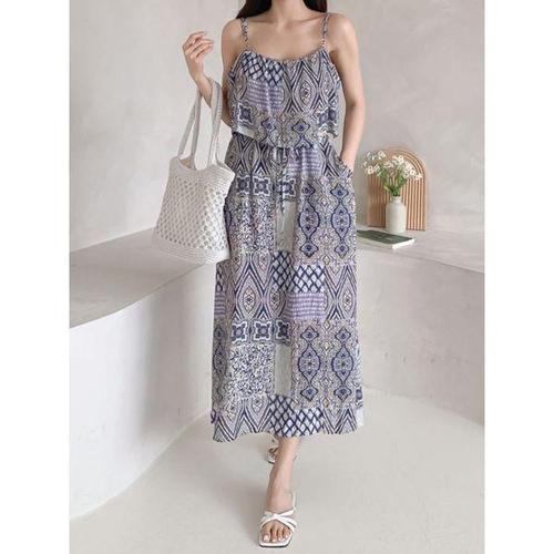 [샵앤]여성 끈나시 휴양지 바캉스룩 기하학 롱원피스 CAT-WDR-4641-퍼플