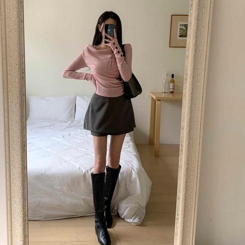 밸리걸 세이브존01 오프숄더 끈장식 슬림 골지 니트 612031-1