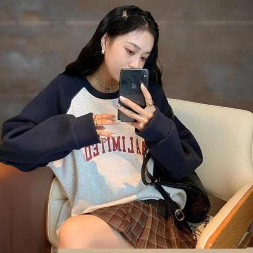 75kg까지 날씬해보이는 1+1 여성 빈티지 배색 레터링 나그랑 크롭 맨투맨 티셔츠 봄 가을 빅사이즈 오버핏 프린트 카운티 얇은 스포츠 학생복 루즈핏 심플 제인드 라운드 캐주얼 티