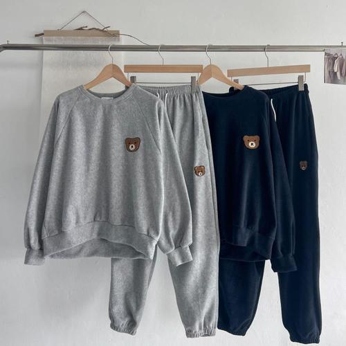 [옷자락] 여성 곰 디자인 나그랑 후리스 맨투맨과 조거팬츠 세트