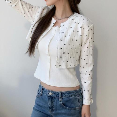 [하프클럽/]여성용 얇은 폴리 슬림핏 꽃무늬 크롭 나시와 가디건 세트