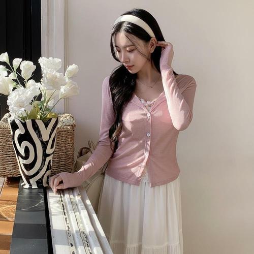 |CHD28FE|여성용 브이넥 레이스 버튼 나시와 골지 가디건 세트