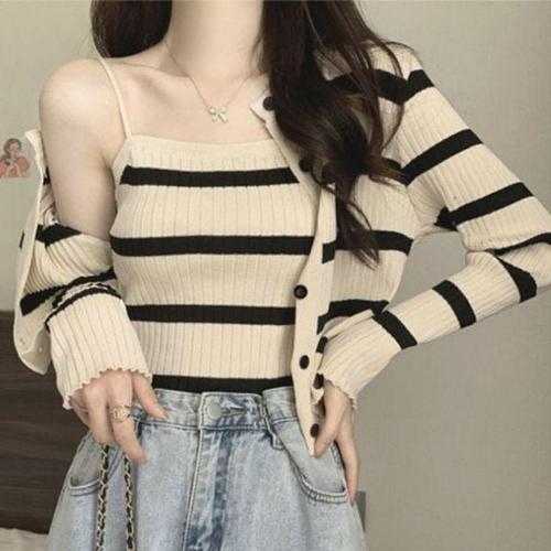 [에이치플러스몰]여성 니트 데일리 가디건 끈나시 클래식 세트 세로 골