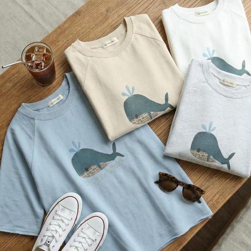 [다잇템]여성용 SS 반소매 나염 고래 코튼 티셔츠