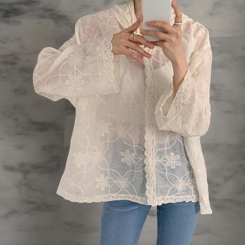 TEMU 여성용 빈티지 스타일 블랙 플로럴 벨벳 메쉬 탑 - 치파오 칼라, 시스루 소매, 화려한 여성을 위한 우아한 티셔츠
