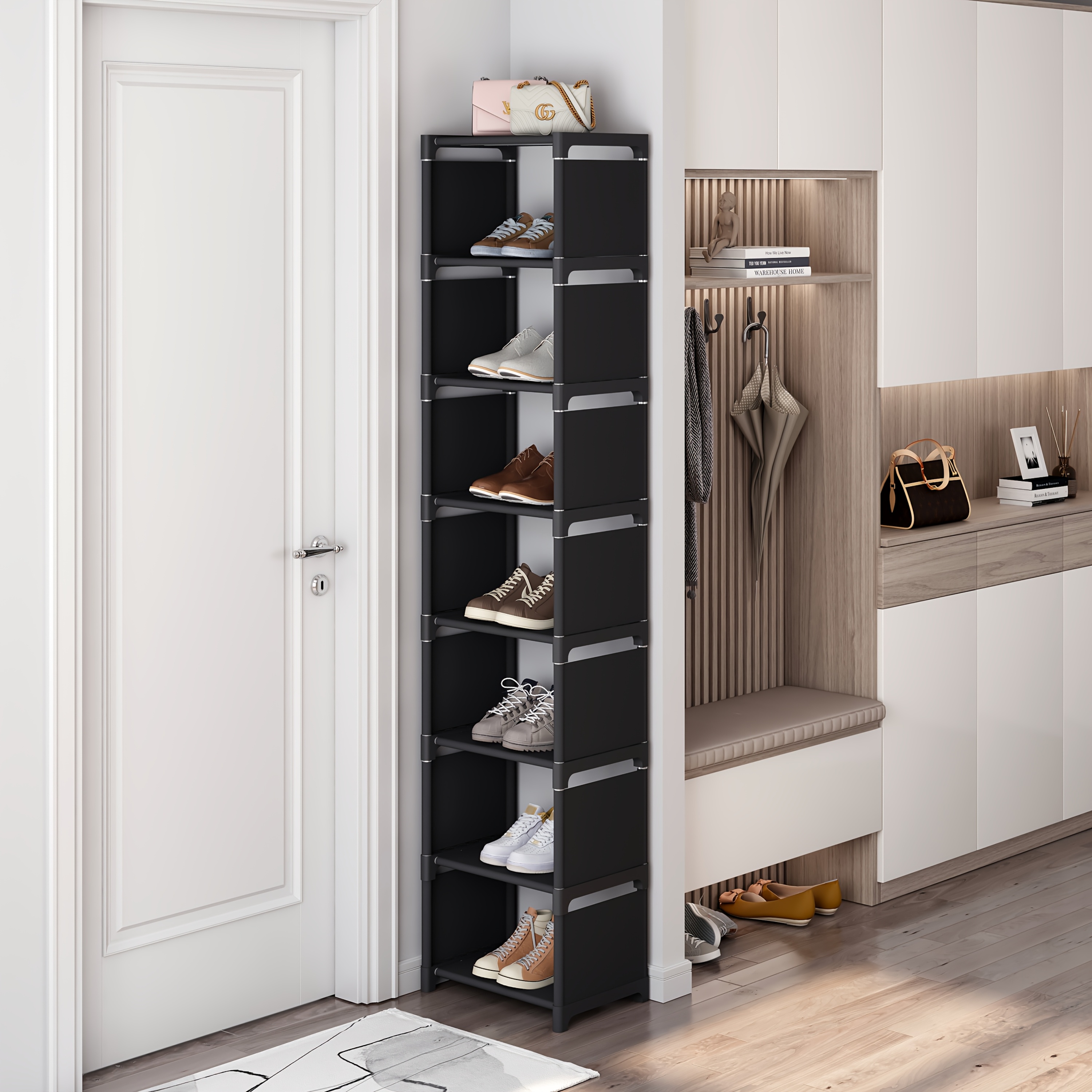 TEMU 8단 초박형 신발 정리대, 금속 및 플라스틱 재질, 독립형, 먼지 덮개 포함, 신발 및 부츠 4-7켤레 수납 가능, 현관, 옷장, 가정 및 기숙사에 적합, 실용적인 신발 수납 정리함.