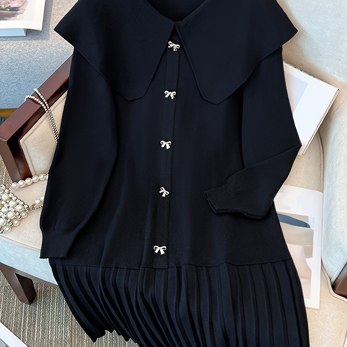 TEMU 여성용 플리츠 롱 슬리브 미디 드레스 - 루즈핏 라운드넥 솔리드 컬러, 봄 여름 가을 캐주얼 휴가 리조트 웨어, 플로우리 패브릭 원피스