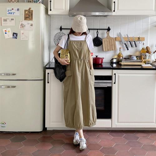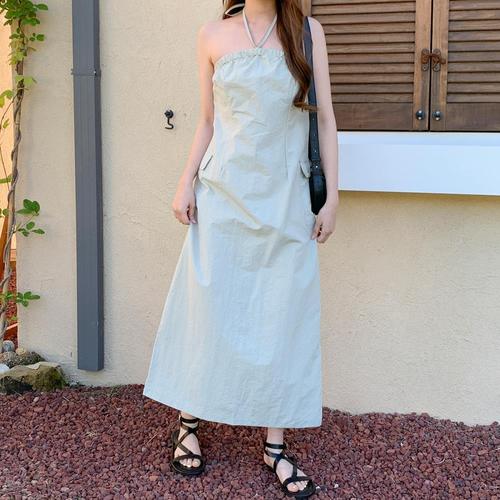 [옷자락] 여자 홀터넥 끈 카고 나일론 롱 원피스