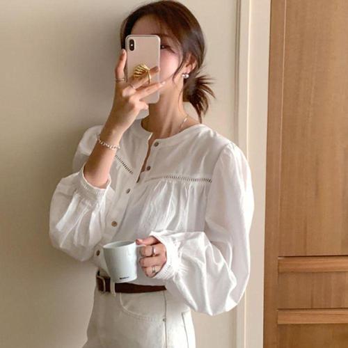 긴팔 블라우스 펀칭 셔츠 퍼프소매 노카라 디자인 WFLACV1