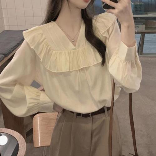 여자 여름 로맨틱 핀턱 날개 프릴 블라우스