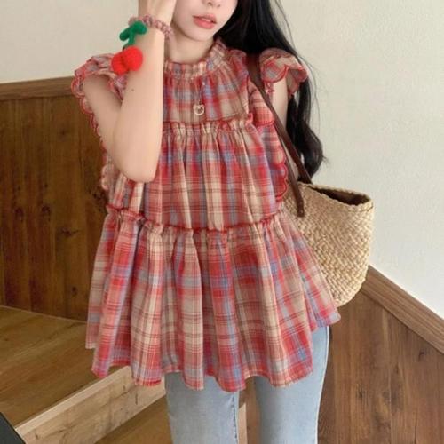 [다잇템]여자 캉캉 날개 체크 프릴 레드 블라우스