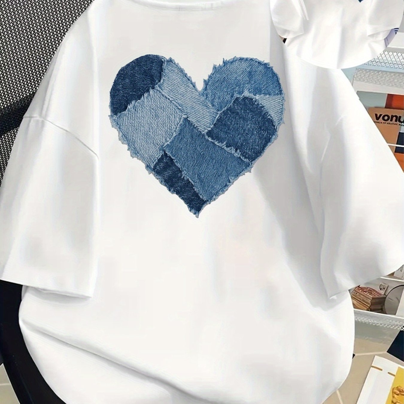 TEMU 프론트 & 백 프린팅 반팔 티셔츠 - 데님 패치워크 하트 디자인, 데님 소재 - 여성용 봄/여름 트렌디 프린팅 티셔츠, 패셔너블 아이템, 다용도 캐주얼 웨어