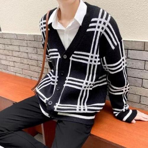 [엠클로]남자 오버핏 브이넥 스틱 배색 패턴 니트가디건 3컬러