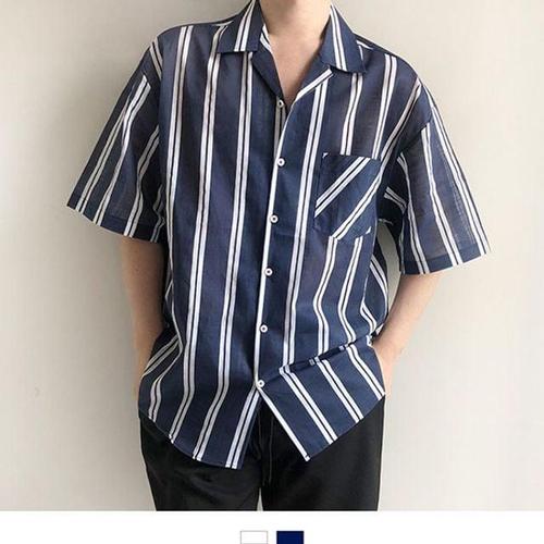 [에이치플러스몰]오버핏 스트라이프 오픈카라 남자 반팔셔츠
