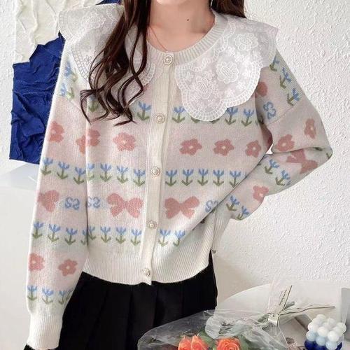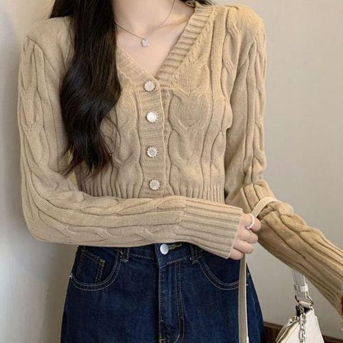[모노무드]LMO 빅단추 케이블니트 프린트포커스 레이디스 유니크 브이컷 세미크롭 니트집업