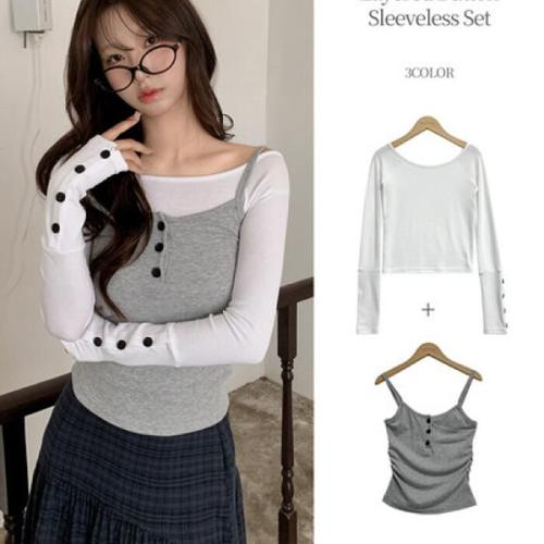 더핑크 / 지딘 슬림핏 레이어드 버튼 나시 + 버튼 긴팔티 set