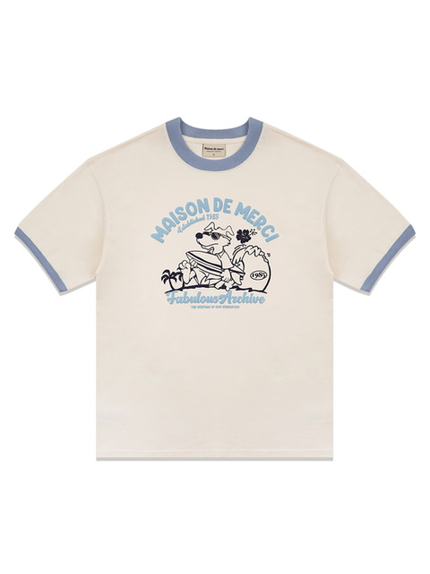 [패블러스아카이브] UNISEX 오버핏 퍼피서핑 링거 반소매 티셔츠 크림(FCE2TS401M)