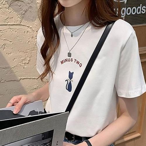 [셀러허브_여성트랜드패션]ONM 여성 티셔츠 여자 라운드넥 냥이 반팔 티셔츠