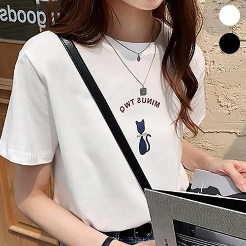 [셀러허브_여성트랜드패션]라운드넥 반팔 티 냥이레터링 기본티셔츠