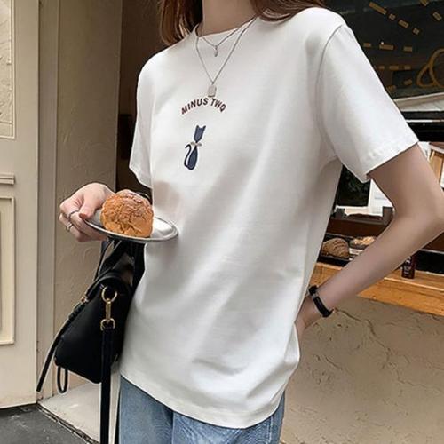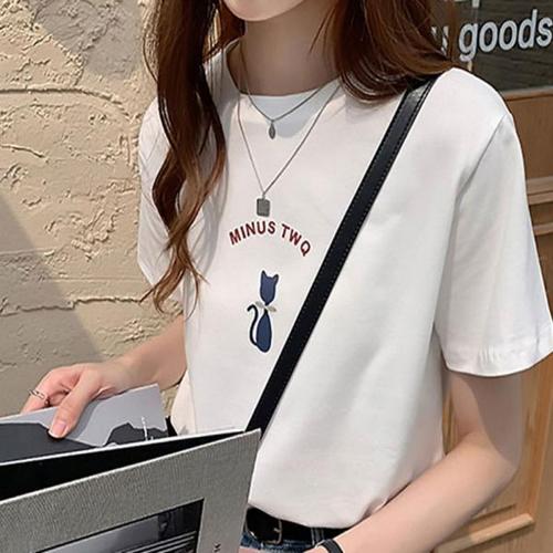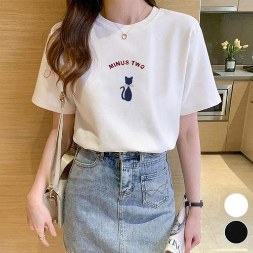 [에이치플러스몰]반팔 라운드넥 여성 편한 냥이 티셔츠