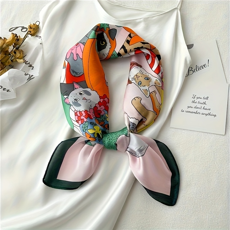 TEMU 1 여성용 재미있는 동물 프린트 스퀘어 스카프 - 귀여운 만화 동물, 생동감 있는 색상과 기발한 패턴이 돋보이는 스타일리시 폴리에스터 넥웨어, 패셔너블한 의상에 완벽