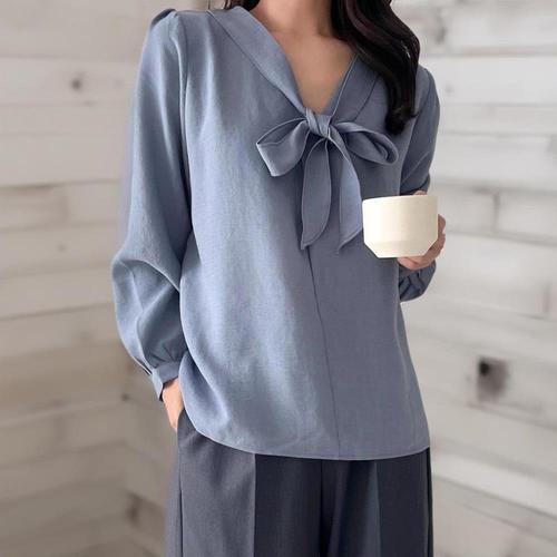 [신상오픈런]여성 가을 리본 넥타이 브이넥 루즈핏 하객용 블라우스