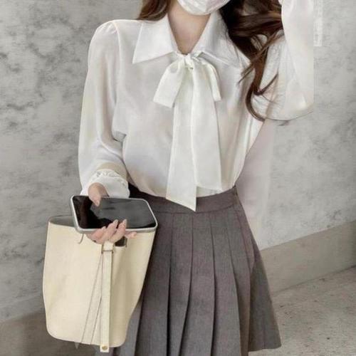 [다잇템][다잇템] 여성 시폰 롱슬리브 스타일 넥타이 흰색 리본 셋업 블라우스_22819691_588872
