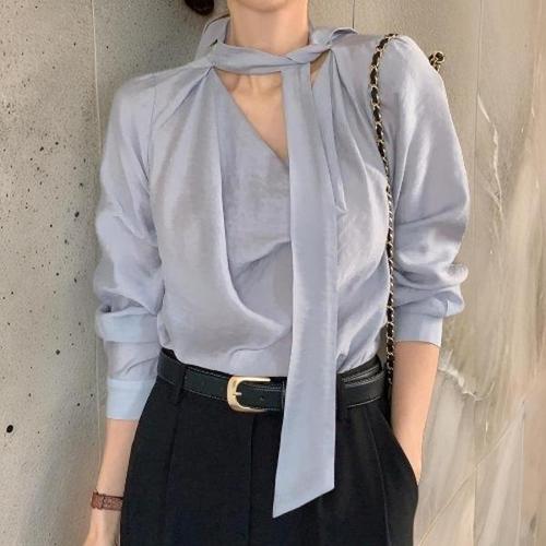 [신상오픈런]넥타이 브이넥 셔링 연주회 비서 봄블라우스 여성셔츠