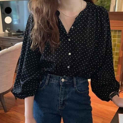 [오노마] ONM 여성 라운드넥 도트 밴딩 블라우스 URK381 풍기 면 블