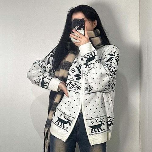 [셀럽하우스]코위찬 WVNA4362 노르딕 눈꽃 니트 집업 가디건 스웨터 티 2색