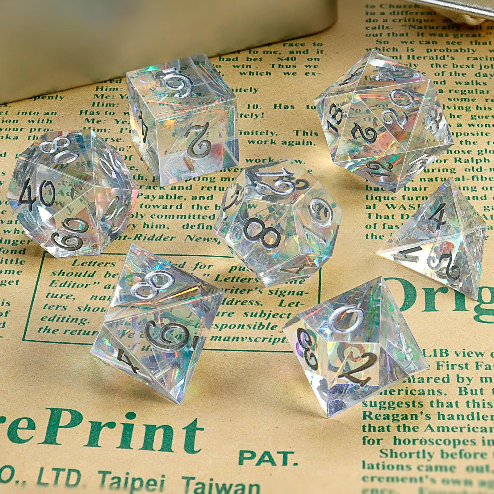 보드 게임용 다면체 투명 레진 주사위 7종 세트, 여러 색상의 빛을 굴절시킴