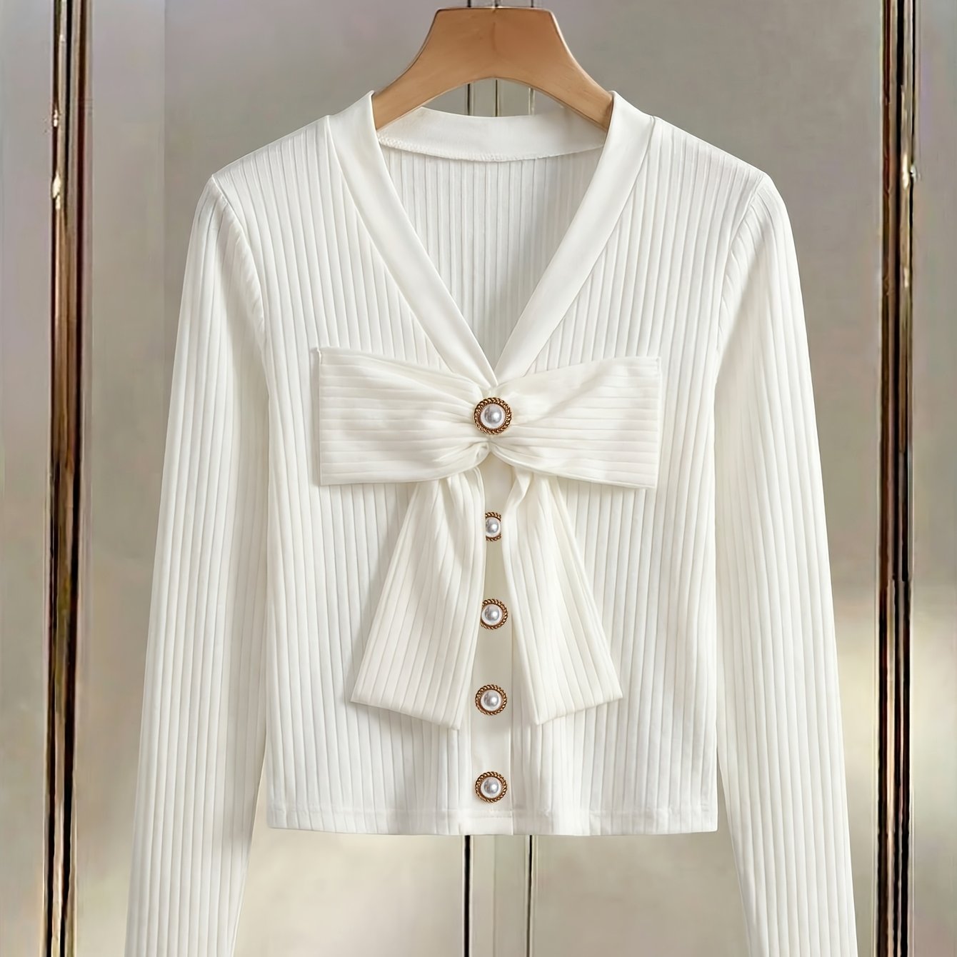 TEMU 여성용 화이트 리본 비즈 탑, V넥, 골지 디자인, 핏되는 숏 스타일, 우아한 가을/겨울 데이트 또는 출퇴근에 완벽, 긴소매