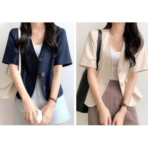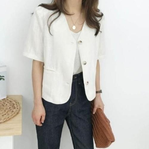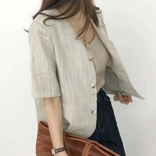린넨반팔자켓 크롭 브이넥 노카라 여름 여성 재킷